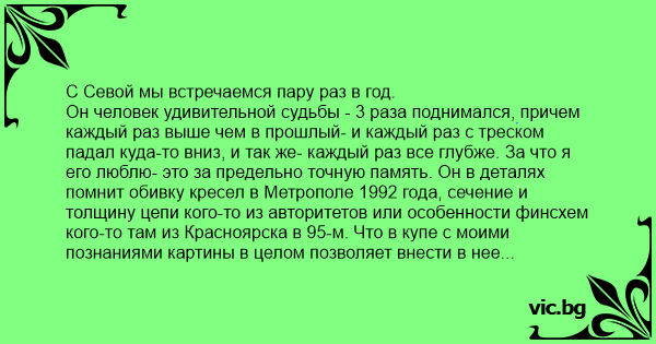 Он человек удивительной судьбы - 3 раза поднимался, причем каждый раз выше чем в прошлый- и каждый раз с треском падал куда-то вниз, и так же- каждый раз все глубже. За что я его люблю- это за предельно точную память. Он в деталях помнит обивку кресел в Метрополе 1992 года, сечение и толщину цепи кого-то из авторитетов или особенности финсхем кого-то там из Красноярска в 95-м. Что в купе с моими познаниями картины в целом позволяет внести в нее множество мелких уточнений, так необходимых мне как исследователю данного периода истории.