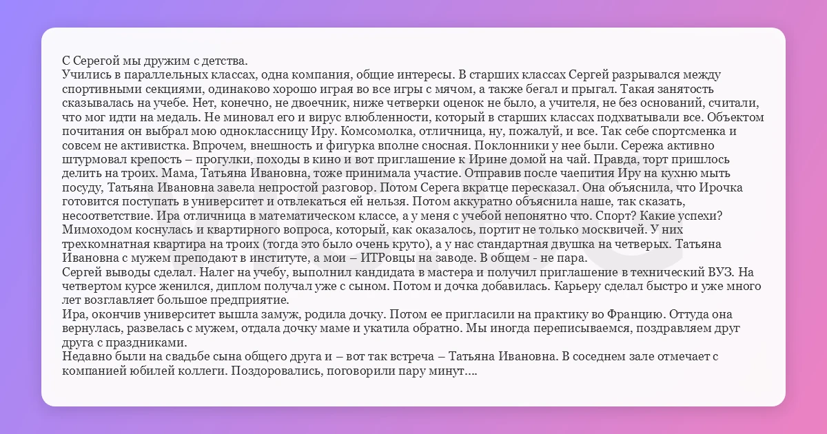 С Серегой мы дружим с детства. Учились в параллельных классах, одна компания, общие интересы. В старших классах Сергей разрывался между спортивными секциями, одинаково хорошо играя во все игры с мячом, а также бегал и прыгал. Такая занятость сказывалась на учебе. Нет, конечно, не двоечник, ниже четверки оценок не было, а учителя, не без оснований, считали, что мог идти на медаль. Не миновал его и вирус влюбленности, который в старших классах подхватывали все. Объектом почитания он выбрал мою одноклассницу Иру. Комсомолка, отличница, ну, пожалуй, и все. Так себе спортсменка и совсем не активистка. Впрочем, внешность и фигурка вполне сносная. Поклонники у нее были. Сережа активно штурмовал крепость – прогулки, походы в кино и вот приглашение к Ирине домой на чай. Правда, торт пришлось делить на троих. Мама, Татьяна Ивановна, тоже принимала участие. Отправив после чаепития Иру на кухню мыть посуду, Татьяна Ивановна завела непростой разговор. Потом Серега вкратце пересказал. Она объяснила, что Ирочка готовится поступать в университет и отвлекаться ей нельзя. Потом аккуратно объяснила наше, так сказать, несоответствие. Ира отличница в математическом классе, а у меня с учебой непонятно что. Спорт? Какие успехи? Мимоходом коснулась и квартирного вопроса, который, как оказалось, портит не только москвичей. У них трехкомнатная квартира на троих (тогда это было очень круто), а у нас стандартная двушка на четверых. Татьяна Ивановна с мужем преподают в институте, а мои – ИТРовцы на заводе. В общем - не пара. Сергей выводы сделал. Налег на учебу, выполнил кандидата в мастера и получил приглашение в технический ВУЗ. На четвертом курсе женился, диплом получал уже с сыном. Потом и дочка добавилась. Карьеру сделал быстро и уже много лет возглавляет большое предприятие. Ира, окончив университет вышла замуж, родила дочку. Потом ее пригласили на практику во Францию. Оттуда она вернулась, развелась с мужем, отдала дочку маме и укатила обратно. Мы иногда переписываемся, поздравляем друг друга с праздниками. Недавно были на свадьбе сына общего друга и – вот так встреча – Татьяна Ивановна. В соседнем зале отмечает с компанией юбилей коллеги. Поздоровались, поговорили пару минут. - Я рада за вас мальчики, молодцы, что у вас все хорошо. Потом помолчав добавила: - Прости меня, Сережа. Офигеть! Человек, который считал себя вторым после Самого, просит прощения. Сергей не растерялся: - Что Вы, Татьяна Ивановна! Вам СПАСИБО! Ближе к вечеру Сергей вспомнил о встрече. - Интересно, а как бы у меня с Иркой сложилось бы? - А что тебя сейчас не устраивает? - Да, нет, все устраивает. Просто интересно. - Серег, история не знает сослагательного… Ну, если хочешь, могу рассказать. Поступили бы вы на один факультет. Темы диссертаций вам бы подсказали, подобрали бы и оппонентов. Сказали бы в какой квартире жить, какую мебель покупать, с кем дружить, где отдыхать, какие имена давать детям. Работал бы на кафедре, синус о косинус бы перетирал. Сейчас бы отмечал юбилей в соседнем зале. Да, и забудь о наших милых студенческих шалостях. Ты этого хочешь? - Нееет…