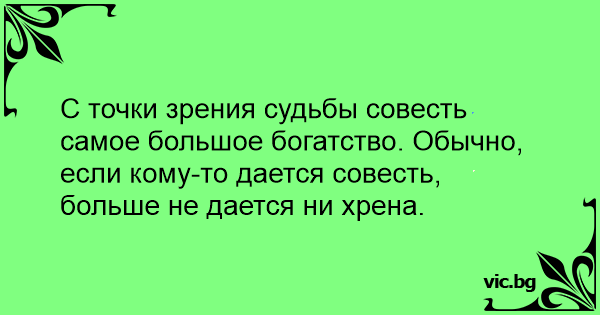 С точки зрения судьбы совесть самое большое богатство. Обычно, если кому-то дается совесть, больше не дается ни хpeнa.