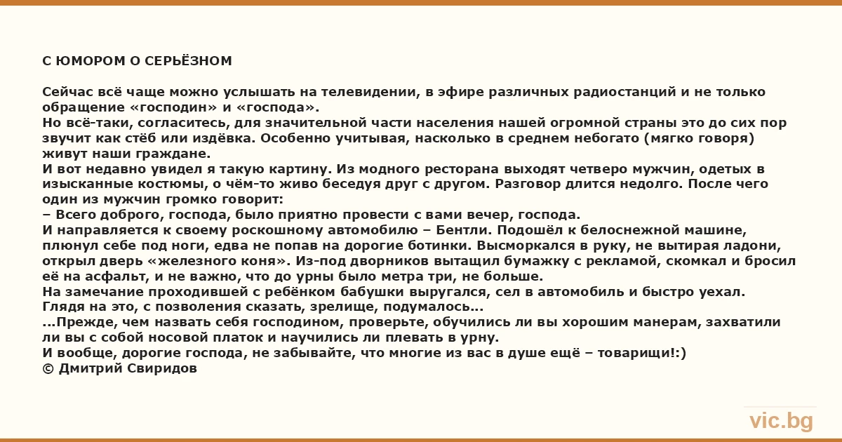 С ЮМОРОМ О СЕРЬЁЗНОМ Сейчас всё чаще можно услышать на телевидении, в эфире различных радиостанций и не только обращение «господин» и «господа».<br />Но всё-таки, согласитесь, для значительной части населения нашей огромной страны это до сих пор звучит как стёб или издёвка. Особенно учитывая, насколько в среднем небогато (мягко говоря) живут наши граждане.<br />И вот недавно увидел я такую картину. Из модного ресторана выходят четверо мужчин, одетых в изысканные костюмы, о чём-то живо беседуя друг с другом. Разговор длится недолго. После чего один из мужчин громко говорит: <br />– Всего доброго, господа, было приятно провести с вами вечер, господа.<br />И направляется к своему роскошному автомобилю – Бентли. Подошёл к белоснежной машине, плюнул себе под ноги, едва не попав на дорогие ботинки. Высморкался в руку, не вытирая ладони, открыл дверь «железного коня». Из-под дворников вытащил бумажку с рекламой, скомкал и бросил её на асфальт, и не важно, что до урны было метра три, не больше.<br />На замечание проходившей с ребёнком бабушки выругался, сел в автомобиль и быстро уехал.<br />Глядя на это, с позволения сказать, зрелище, подумалось...<br />...Прежде, чем назвать себя господином, проверьте, обучились ли вы хорошим манерам, захватили ли вы с собой носовой платок и научились ли плевать в урну.<br />И вообще, дорогие господа, не забывайте, что многие из вас в душе ещё – товарищи!:)<br />© Дмитрий Свиридов