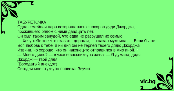 ТАБУРЕТОЧКА Одна семейная пара возвращалась с похорон дяди Джорджа, прожившего рядом с ними двадцать лет.