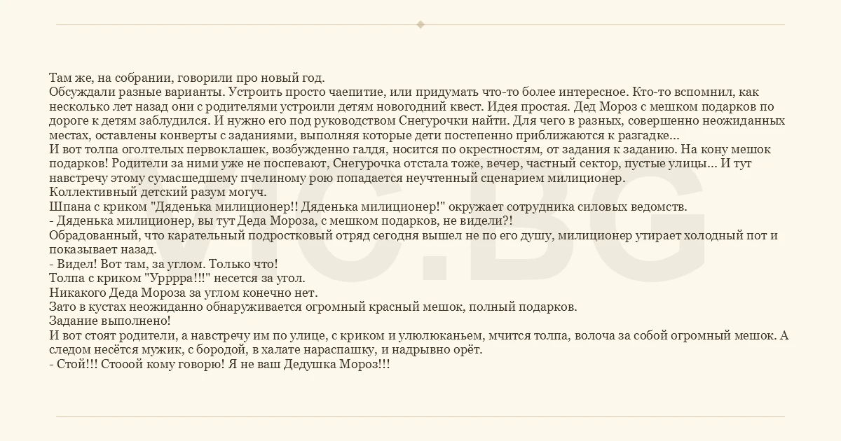 Там же, на собрании, говорили про новый год. Обсуждали разные варианты. Устроить просто чаепитие, или придумать что-то более интересное. Кто-то вспомнил, как несколько лет назад они с родителями устроили детям новогодний квест. Идея простая. Дед Мороз с мешком подарков по дороге к детям заблудился. И нужно его под руководством Снегурочки найти. Для чего в разных, совершенно неожиданных местах, оставлены конверты с заданиями, выполняя которые дети постепенно приближаются к разгадке... И вот толпа оголтелых первоклашек, возбужденно галдя, носится по окрестностям, от задания к заданию. На кону мешок подарков! Родители за ними уже не поспевают, Снегурочка отстала тоже, вечер, частный сектор, пустые улицы... И тут навстречу этому сумасшедшему пчелиному рою попадается неучтенный сценарием милиционер. Коллективный детский разум могуч. Шпана с криком "Дяденька милиционер!! Дяденька милиционер!" окружает сотрудника силовых ведомств. - Дяденька милиционер, вы тут Деда Мороза, с мешком подарков, не видели?! Обрадованный, что карательный подростковый отряд сегодня вышел не по его душу, милиционер утирает холодный пот и показывает назад. - Видел! Вот там, за углом. Только что! Толпа с криком "Урррра!!!" несется за угол. Никакого Деда Мороза за углом конечно нет. Зато в кустах неожиданно обнаруживается огромный красный мешок, полный подарков. Задание выполнено! И вот стоят родители, а навстречу им по улице, с криком и улюлюканьем, мчится толпа, волоча за собой огромный мешок. А следом несётся мужик, с бородой, в халате нараспашку, и надрывно орёт. - Стой!!! Стооой кому говорю! Я не ваш Дедушка Мороз!!!