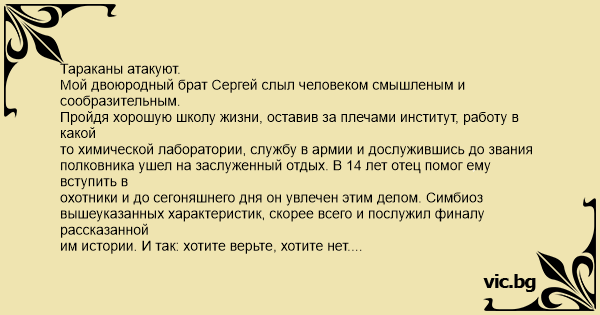 Тараканы атакуют. Мой двоюродный брат Сергей слыл человеком смышленым и сообразительным. Пройдя хорошую школу жизни, оставив за плечами институт, работу в какой то химической лаборатории, службу в армии и дослужившись до звания полковника ушел на заслуженный отдых. В 14 лет отец помог ему вступить в охотники и до сегоняшнего дня он увлечен этим делом. Симбиоз вышеуказанных характеристик, скорее всего и послужил финалу рассказанной им истории. И так: хотите верьте, хотите нет. Проживая в свое время в коммунальной квартире сталинского дома на Комсомольском проспекте, мой брат испытывал определенный дискомфорт по причине наличия мусоропровода непосредственно в коридоре квартиры. Причина дискомфорта самая банальная- тараканы. Будучи химиком, охотником, да к тому же военным, Серега не мог с этим смириться. Солдатская смекалка подсказала идею борьбы с данным неприятелем. В качестве оружия массового поражения был выбран дихлофос. Благо это добра в тогдашних хозяйственных магазинах было предостаточно. После нанесения первичного химического удара, ряды рыжего неприятеля покидали свои уютные места и лезли изо всех щелей, валялись по полу и дрыгали лапками. Через некоторое время пол кухни и комнаты был покрыт полчищами балдеющего рыжего неприятеля. Дальнейшая тактика боя велась с применением вакуумновсасывающих механических средств, в простонародье называемых пылесос. Недовольные твари, с невероятной скоростью исчезали в жерле механического помощника вмести с пылью. Нанеся по неприятелю удар тяжелой техникой, Серега однако не успокоился. Будучи человеком образованным в области химии, он решил закрепить полученный результат и увеличить эффект поражения, направил во всасывающий раструб пылесоса струю, распыляемого баллончиком дихлофоса. Эффект был потрясающим. Что характерно, критическая масса образовалась весьма быстро. Если вы когда нибудь были свидетелем тайфуна или урагана, то они просто курят по сравнению с тем, что произошло дальше. Вспышка и страшный грохот наполнил стены небольшой комнаты. Взрыв пылесоса «Тайфун» наполненного тараканами и пылью был эквивалентен грамм 50 тротила. Естественно вслед за вспышкой поднялся гриб из тараканов и пыли. Венчала гриб верхняя часть пылесоса. Не знаю успел ли Серега принять позу лежа, ногами в сторону эпицентра, но когда пришел в себя, его очам предстала ужасающая картина. Пыль вместе с тараканами равномерно покрыла всю комнату. Дышать было невозможно. При этом рыжие твари, испытав бешеное ускорение, моментально протрезвели от дихлофоса и оценив коварство и изобретательность противника, со страшной скоростью скрывались во всех щелях. Механический помощник молчал. Как потом выяснилось замолчал навсегда. Безвыходное положение из шести букв смекнул Серега. Солдатская смекалка его не подвела.