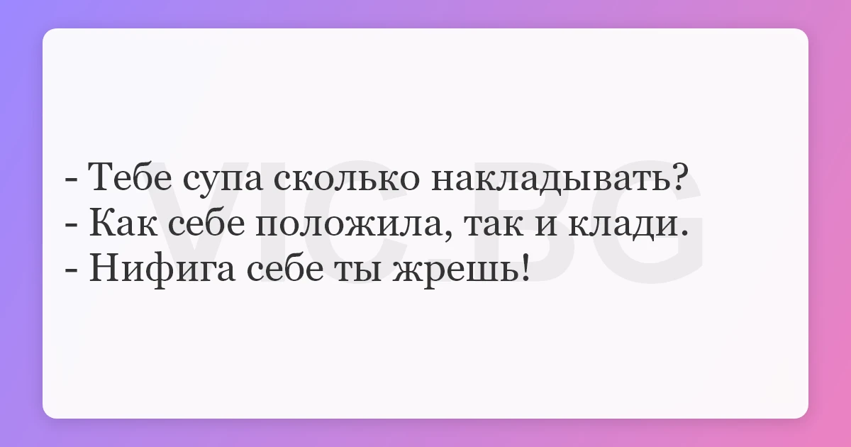- Тебе супа сколько накладывать? - Как себе положила, так и клади. - Нифига себе ты жрешь!