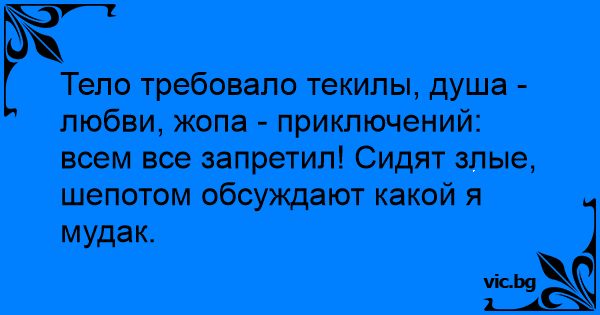 Тело требовало текилы, душа - любви, жoпa - приключений: всем все запретил! Сидят злые, шепотом обсуждают какой я mудak.