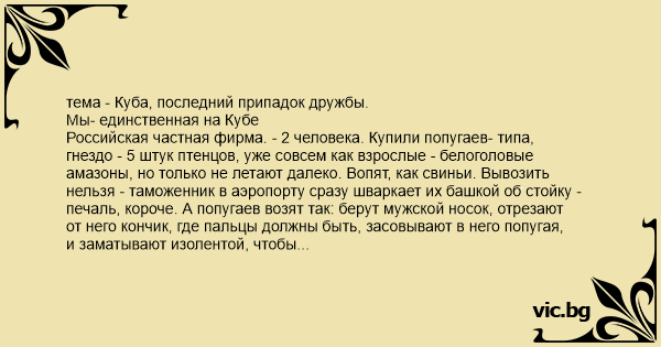 тема - Куба, последний припадок дружбы. Мы- единственная на Кубе Российская частная фирма. - 2 человека. Купили попугаев- типа, гнездо - 5 штук птенцов, уже совсем как взрослые - белоголовые амазоны, но только не летают далеко. Вопят, как свиньи. Вывозить нельзя - таможенник в аэропорту сразу шваркает их башкой об стойку - печаль, короче. А попугаев возят так: берут мужской носок, отрезают от него кончик, где пальцы должны быть, засовывают в него попугая, и заматывают изолентой, чтобы торчала только башка и хвост. После этого засовывают ему в пасть таблетку димедрола, и суют плд кран с водой клювом в струю. Попугай глотает таблетку и благополучно засыпает минут через двадцать. Проблема была в том, что димедрола в Гаване мы не нашли. Взяли по знакомству у посольского врача тезерцин - а это такая зараза, здорового мужика на 12 часов кладет вмертвую. Ну, накормили мы попугаев тезерцином - только их что-то слабо зацепило - вроде спят, но как-то некрепко. Ну, в общем, прицепил я булавками эти носки с попугаями себе под куртку - 5 штук, прошел таможню - и в самолет. Они , правда , чирикали, но таможенник внисмания не обратил - там такое творилось - короче - вывод советских специалистов с семьями с острова Свободы. Бардак невероятный - мебель, приемники, вещи, слезы, Чемодан потеряли, бабушка, где бабушка, дети ревут - пожар на Казанском вокзале одним словом. Ну я и проскочил. Сижу в кафушке, Чивас Ригал попиваю в хорошей компании. Короче, до самолета 0,7 съел. По трапу еле забрался. А лететь - 23 часа с остановками в Гандере и Шанноне. Ну я забрался на свое место, откинулся, попросил у стюардессы мешок полиэтиленовый, выгрузил туда своих пернатых друзей - они к тому времени совсем очнулись, освободил их там от носков. Летим. Я - сплю. Просыпаюсь - от того, что меня трясут за плечо, и слышу нежный голос -Родной, кушать то будешь? Я -Угм. Тот-же голос - а я все не открываю глаз - а выпить не хочешь? Я, так-же не открывая глаз, - тащи! И чувствую я, что-то не то - стюардесса ласковая, в самолете тишина - глаза открываю и вижу такую душераздирающую картину - пустой салон, в иллюминаторах ночь, моторы гудят, а по спинкам кресел перелетают, бодро чирикая, попугаи. Здравствуй, белая горячка! Про попугаев я к тому времени забыл напрочь, зато помнил отлично, что садился в набитый самолет, еще чей-то торшер стоял в проходе. И вот я в печали размышляю -Где я? и , главное, куда лечу? Тут, белый лебедь - стюардесса. Я, натурально, спрашиваю - А где все? А она -так, без сожаления - а наши все в Гандере ( это Канада) свалили в невозврат, целый самолет. Там в Гандере, на советских рейсах кстати, дежурил даже специальный чиновник по иммиграции. Я - такой важный - а чего меня не разбудили? - она так резонно возражает - ну не в Канаду же ты летишь со своими контрабандными попугаями, тебя не пустят все равно, а нам еще жратву и выпивку надо на кого-то списать! - В общем, продолжение рейса помню смутно. Второй пилот по салону попугаев гонял, стюардессы помнится, как-то не вполне были одеты - Летайте самолетами Аэрофлота - Ура, Борис Абрамыч! Кстати, с тех пор рейсы на Лиму через Гавану в Гандере не садятся. А попугаи до сих пор живы - говорят, они триста лет живут - ну, это вряд-ли. Мои точно столько не протянут. Разьве что до следующей перестройки - и назад на Кубу - контрабандой.
