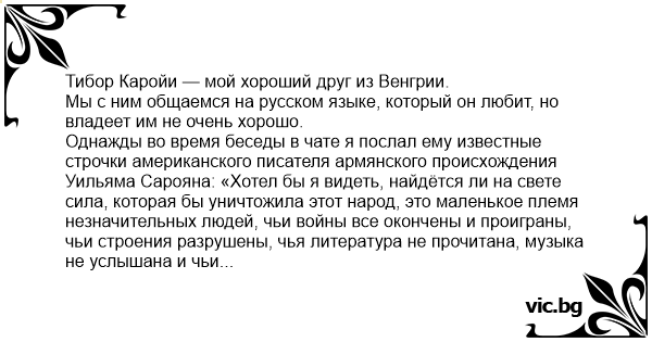 Тибор Каройи — мой хороший друг из Венгрии. Мы с ним общаемся на русском языке, который он любит, но владеет им не очень хорошо. Однажды во время беседы в чате я послал ему известные строчки американского писателя армянского происхождения Уильяма Сарояна: «Хотел бы я видеть, найдётся ли на свете сила, которая бы уничтожила этот народ, это маленькое племя незначительных людей, чьи войны все окончены и проиграны, чьи строения разрушены, чья литература не прочитана, музыка не услышана и чьи молитвы оставлены без ответа. Вперёд, уничтожайте армянский народ! Посмотрите, удастся ли вам это сделать. Гоните их в пустыню без хлеба и воды, сожгите их дома и церкви. А потом посмотрите, не будут ли они вновь смеяться, петь и молиться, и когда двое из них встретятся где-нибудь на земле, посмотрите, не создадут ли они новую Армению!». Не уловив горестного сарказма автора, потрясённый Тибор спросил: — Какая cboлoчь это написала?