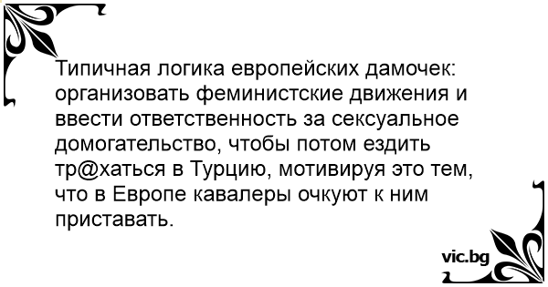 Типичная логика европейских дамочек: организовать феминистские движения и ввести ответственность за сексуальное домогательство, чтобы потом ездить тр@хаться в Турцию, мотивируя это тем, что в Европе кавалеры очкуют к ним приставать.