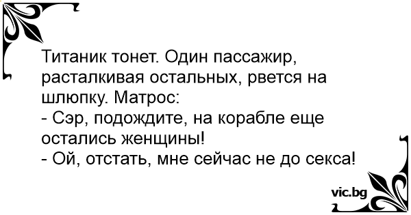При потъването на "Титаник" мъж се тика упорито към спасителните лодки. Капитанът му казва: