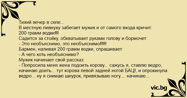 Тихий вечер в селе... В местную пивнуху забегает мужик и от самого входа кричит: 200 грамм водки!!! Садится за стойку, обхватывает руками голову и бормочет: - Это необъяснимо, это необъяснимо!!!!! Бармен, наливая 200 грамм водки, спрашивает: - А чего хоть необъяснимо? Мужик начинает свой рассказ: - Попросила меня жена подоить корову... сажусь я, ставлю ведро, начинаю доить... тут корова левой задней ногой БАЦ!, и опрокинула ведро... ну я снимаю шнурок, привязываю ногу.... начинаю доить дальше, тут она другой ногой БАЦ!, снова опрокидывает ведро... я, обозленный, снимаю второй шнурок, привязываю вторую ногу... начинаю доить дальше... И она хвостом меня по морде, я падаю, задеваю ведро, ведро разливается... Я поднимаюсь, снимаю ремень, привязываю хвост к перекладине, у меня падают штаны, и тут заходит жена. Ну, необъяснимо!!!