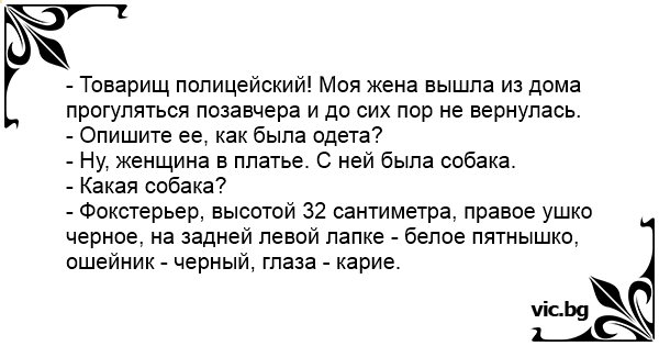 - Товарищ полицейский! Моя жена вышла из дома прогуляться позавчера и до сих пор не вернулась.