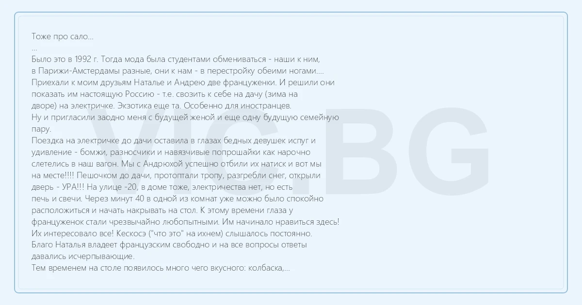 Тоже про сало... ... Было это в 1992 г. Тогда мода была студентами обмениваться - наши к ним, в Парижи-Амстердамы разные, они к нам - в перестройку обеими ногами.... Приехали к моим друзьям Наталье и Андрею две француженки. И решили они показать им настоящую Россию - т.е. свозить к себе на дачу (зима на дворе) на электричке. Экзотика еще та. Особенно для иностранцев. Ну и пригласили заодно меня с будущей женой и еще одну будущую семейную пару. Поездка на электричке до дачи оставила в глазах бедных девушек испуг и удивление - бомжи, разносчики и навязчивые попрошайки как нарочно слетелись в наш вагон. Мы с Андрюхой успешно отбили их натиск и вот мы на месте!!!! Пешочком до дачи, протоптали тропу, разгребли снег, открыли дверь - УРА!!! На улице -20, в доме тоже, электричества нет, но есть печь и свечи. Через минут 40 в одной из комнат уже можно было спокойно расположиться и начать накрывать на стол. К этому времени глаза у француженок стали чрезвычайно любопытными. Им начинало нравиться здесь! Их интересовало все! Кескосэ ("что это" на ихнем) слышалось постоянно. Благо Наталья владеет французским свободно и на все вопросы ответы давались исчерпывающие. Тем временем на столе появилось много чего вкусного: колбаска, картошечка, огурчики-помидорчики, капустка, винишко и водочка. Русская кухня очень заинтересовала девушек. Наташа отвечала на вопросы не переставая. Смысл вопросов был такой: - Кескосэ? - Квашеная капуста. Сделана из обычной капусты и соли (и далее процесс изготовления).(Есс-но на французском) Они кивали, переспрашивали и с опаской пробовали. И вот на столе появилось САЛО! У мужской части населения потекли слюньки. Тут же было налито по стопочкам. Тут же вилки воткнулись в нарезанные беленькие кусочки.... Ну счаззззз!!!!!!! - Кескосэ? - САЛО. (далее разъяснения по-французски) Мы замерли со стопками и вилками - неудобно прерывать все-таки... В процессе разъяснения глаза у бедных девушек становились все больше и больше. В них плескался неподдельный ужас! Животный страх! По окончании речи Натальи они обе, хором, что-то заорали по-своему. На наш резонный вопрос - чего это они - Наташка сказала, что просто рассказала что такое сало и как его делают. - А чего они орут-то? - Это же СВИНОЙ ЖИР!!!! Это же ЯД!!!! Это есть НЕЛЬЗЯ!!!! На что Андрюха, сохраняя каменное лицо и спокойный голос, сказал: - Ну нельзя - так нельзя! ..... И немедленно выпил....... ..... И немедленно закусил..... САЛОМ. Я тоже. Француженки долго и упорно молча глядели на нас. МЫ НЕ УМИРАЛИ. Мы жили. И не только жили, а продолжали есть, пить и закусывать. САЛОМ. Часа через два девушки немного успокоились, потом даже улыбаться начали. Но сало, несмотря на все наши уговоры, пробовать категорически отказались. Потом они вернулись к себе на Родину. Что они там рассказали о русских и их диких нравах, мне неизвестно. З.Ы. Наш водитель на рынке сало купил. Домашнее. На работу кусочек принес. Пойду ОТРАВЛЮСЬ. САЛОМ.... Serzheek