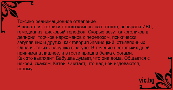 В палате из техники только камеры на потолке, аппараты ИВЛ, гемодиализ, дисковый телефон. Скорые везут алкоголиков в делирии, торчков-наркоманов с передозом, психически загулявших и других, как говорил Жванецкий, отъявленных.