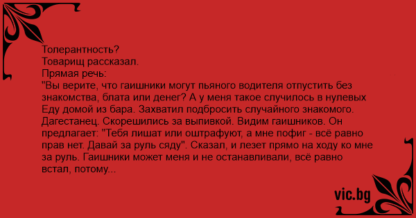 "Вы верите, что гаишники могут пьяного водителя отпустить без знакомства, блата или денег? А у меня такое случилось в нулевых Еду домой из бара. Захватил подбросить случайного знакомого. Дагестанец. Скорешились за выпивкой. Видим гаишников. Он предлагает: "Тебя лишат или оштрафуют, а мне пофиг - всё равно прав нет. Давай за руль сяду". Сказал, и лезет прямо на ходу ко мне за руль. Гаишники может меня и не останавливали, всё равно встал, потому что он мне спиной и дорогу, и даже руль загородил. Гаишник подходит - мы двое за рулём на одном сиденье. Гаишник сплюнул: "Тьфу, педики! Езжайте на хуй отсюда!"