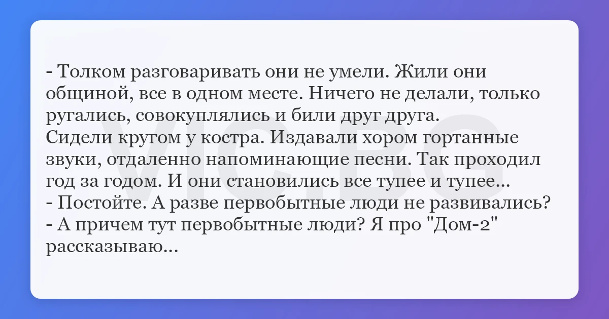 - Толком разговаривать они не умели. Жили они общиной, все в одном месте. Ничего не делали, только ругались, совокуплялись и били друг друга. Сидели кругом у костра. Издавали хором гортанные звуки, отдаленно напоминающие песни. Так проходил год за годом. И они становились все тупее и тупее... - Постойте. А разве первобытные люди не развивались? - А причем тут первобытные люди? Я про "Дом-2" рассказываю...