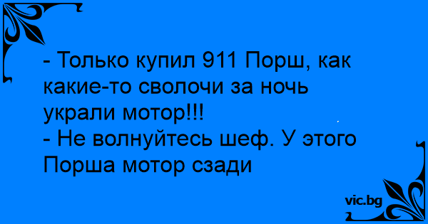 - Только купил 911 Порш, как какие-то сволочи за ночь украли мотор!!!
