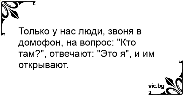 Только у нас люди, звоня в домофон, на вопрос: "Кто там?", отвечают: "Это я", и им открывают.