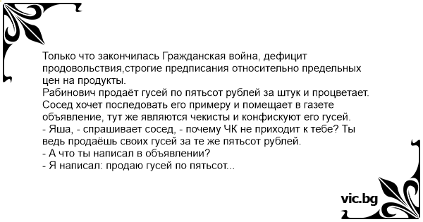 - Яша, - спрашивает сосед, - почему ЧК не приходит к тебе? Ты ведь продаёшь своих гусей за те же пятьсот рублей.