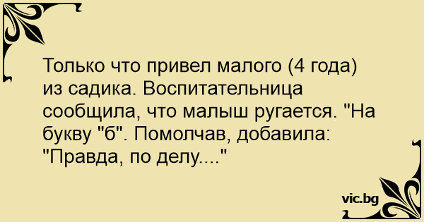 Только что привел малого (4 года) из садика. Воспитательница сообщила, что малыш ругается. "На букву "б". Помолчав, добавила: