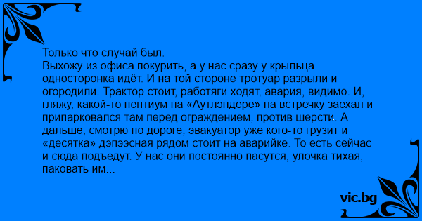 Выхожу из офиса покурить, а у нас сразу у крыльца односторонка идёт. И на той стороне тротуар разрыли и огородили. Трактор стоит, работяги ходят, авария, видимо. И, гляжу, какой-то пентиум на «Аутлэндере» на встречку заехал и припарковался там перед ограждением, против шерсти. А дальше, смотрю по дороге, эвакуатор уже кого-то грузит и «десятка» дэпээсная рядом стоит на аварийке. То есть сейчас и сюда подъедут. У нас они постоянно пасутся, улочка тихая, паковать им удобно. А водила их не видит что ли из-за трактора, стоит себе, курит, дым идёт из окошка. Ну, думаю, пойду, сгоню, пока он проблем не огрёб себе по самые рыжики. Не то, чтобы я альтруист какой, но примут же остолопа, езда по встречке, лишение.