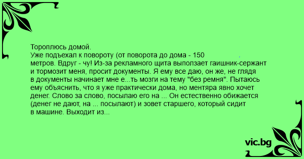 Тороплюсь домой. Уже подъехал к повороту (от поворота до дома - 150 метров. Вдруг - чу! Из-за рекламного щита выползает гаишник-сержант и тормозит меня, просит документы. Я ему все даю, он же, не глядя в документы начинает мне е...ть мозги на тему "без ремня". Пытаюсь ему объяснить, что я уже практически дома, но ментяра явно хочет денег. Слово за слово, посылаю его на ... Он естественно обижается (денег не дают, на ... посылают) и зовет старшего, который сидит в машине. Выходит из "жигуля" капитан и мы с ним очень мило общаемся. Договариваемся, что плачу "штраф на месте". Капитан обращается к сержанту: (К)- Ну так за что мы водителя штрафуем? Сформулируй-ка. (С)- За непристегнутый ремень и за посылание матом на хуй сотрудника правоохранительных органов. Капитан и я согнулись в пополаме. Меня отпустили без денег... Хорошо, когда менты с юмором попадаются :)