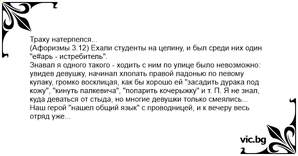 (Афоризмы 3.12) Ехали студенты на целину, и был среди них один "е#арь - истребитель".