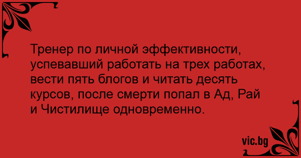 Тренер по личной эффективности, успевавший работать на трех работах, вести пять блогов и читать десять курсов, после смерти попал в Ад, Рай и Чистилище одновременно.