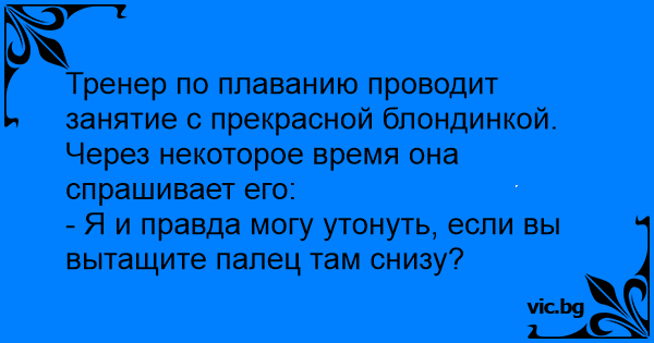 Красива блондинка към треньора по плуване: - Наистина ли ще се удавя ако си извадиш пръстта от там, долу?