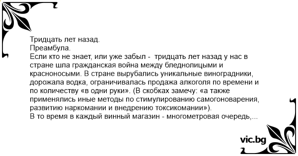 Если кто не знает, или уже забыл - тридцать лет назад у нас в стране шла гражданская война между бледнолицыми и красноносыми. В стране вырубались уникальные виноградники, дорожала водка, ограничивалась продажа алкоголя по времени и по количеству «в одни руки». (В скобках замечу: «а также применялись иные методы по стимулированию самогоноварения, развитию наркомании и внедрению токсикомании»).