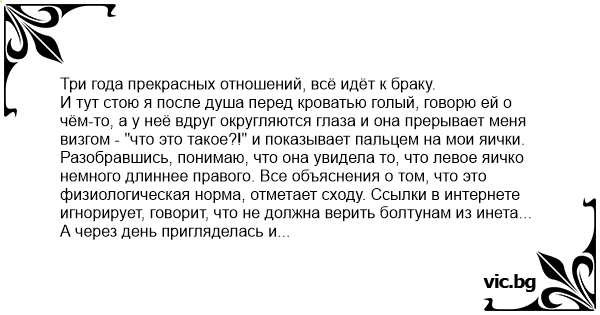 И тут стою я после душа перед кроватью голый, говорю ей о чём-то, а у неё вдруг округляются глаза и она прерывает меня визгом - "что это такое?!" и показывает пальцем на мои яички. Разобравшись, понимаю, что она увидела то, что левое яичко немного длиннее правого. Все объяснения о том, что это физиологическая норма, отметает сходу. Ссылки в интернете игнорирует, говорит, что не должна верить болтунам из инета...
