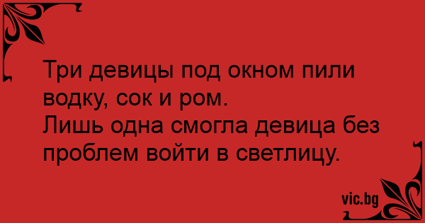 Три девицы под окном пили водку, cok и ром.<br />Лишь одна смогла девица без проблем войти в светлицу.