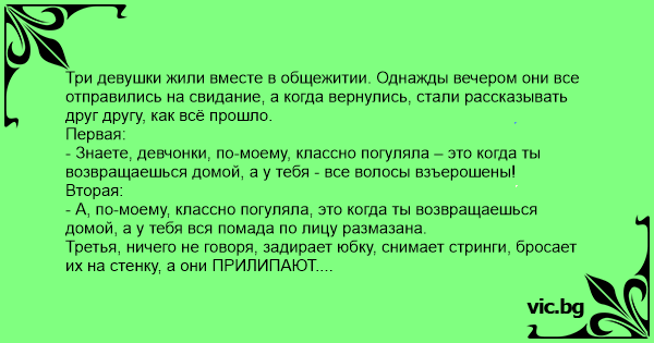Три девушки жили вместе в общежитии. Однажды вечером они все отправились на свидание, а когда вернулись, стали рассказывать друг другу, как всё прошло.
