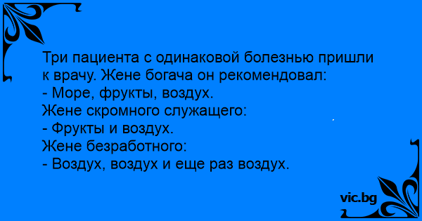 Три пациента с одинаковой болезнью пришли к врачу. Жене богача он рекомендовал: