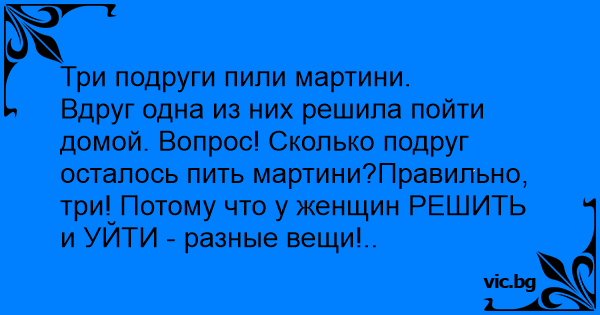 Вдруг одна из них решила пойти домой. Вопрос! Сколько подруг осталось пить мартини?Правильно, три! Потому что у женщин РЕШИТЬ и УЙТИ - разные вещи!..