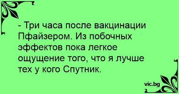 - Три часа после вакцинации Пфайзером. Из побочных эффектов пока легкое ощущение того, что я лучше тех у кого Спутник.