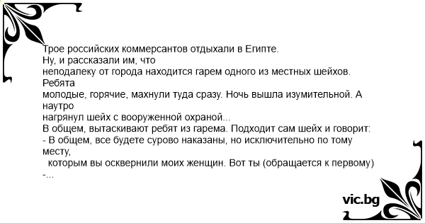 Трое российских коммерсантов отдыхали в Египте. Ну, и рассказали им, что неподалеку от города находится гарем одного из местных шейхов. Ребята молодые, горячие, махнули туда сразу. Ночь вышла изумительной. А наутро нагрянул шейх с вооруженной охраной... В общем, вытаскивают ребят из гарема. Подходит сам шейх и говорит: - В общем, все будете сурово наказаны, но исключительно по тому месту, которым вы осквернили моих женщин. Вот ты (обращается к первому) - что у тебя в России было? - Да так, магазин. Оружейный. Оружием торговали, ножами охотничьими... - Ладно, тогда мы тебе сейчас твой хуй отстрелим или отрежем. По твоему выбору. А у тебя что было в России? (ко второму) - Тоже магазин. Для пожарных. Сигнализации разные, огнетушители... - Понятно. Сейчас мы твой хуй на медленном огне отжигать будем. Ну, а у тебя что в России было? (к третьему) - Да тоже магазин. Только кондитерский. Конфетами торговали, в основном такими, чтоб сосать...