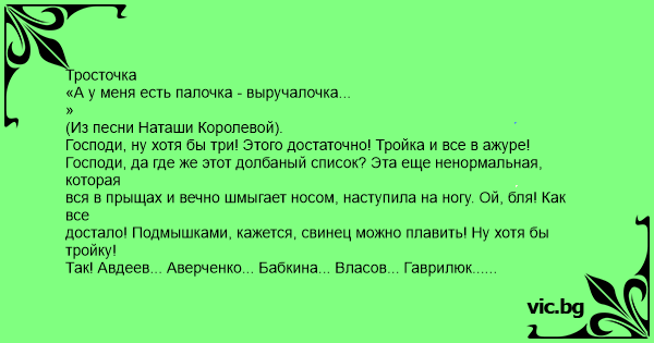 Тросточка «А у меня есть палочка - выручалочка...<br />»<br />(Из песни Наташи Королевой).<br />Господи, ну хотя бы три! Этого достаточно! Тройка и все в ажуре!<br />Господи, да где же этот долбаный список? Эта еще ненормальная, которая<br />вся в прыщах и вечно шмыгает носом, наступила на ногу. Ой, бля! Как все<br />достало! Подмышками, кажется, свинец можно плавить! Ну хотя бы тройку!<br />Так! Авдеев... Аверченко... Бабкина... Власов... Гаврилюк... Гордеев...<br />Yes! Yes! Yes! Гордеев И. А. - 4 (хорошо). Слава тебе, господи!<br />Отмучился! Сейчас в приемную комиссию чтобы узнать насчет зачисления, а<br />потом можно сразу в невесомость прямо до первого сентября! Бля-я-я-я,<br />как хорошо! Теперь буду ходить мимо военкомата и не боятся ни хера! Все,<br />бля! Гордеев И. А. - студент первого курса!<br />Вечером того же дня я заскочил к Сереге в больницу:<br />- Ну, как нога?<br />- Болит еще, еб ее мать! Но врачи говорят, что завтра уже должно<br /> отпустить. У тебя-то как?<br />- Все! Можешь поздравить.<br />- Молодец! Слушай, Илюха, сегодня мама приходила, сказала что есть<br /> горящая путевка в Ягодное. У тебя какие планы?<br />Неделю спустя мы с Сережей высадились из электрички на станции Ягодное.<br />Наверное, со стороны мы смотрелись просто зашибись! Два молодых<br />человека, один из которых на костылях и с гитарой на шее, а другой с<br />огромными, неподъемными сумками и рюкзаком за плечами, не спеша ковыляли<br />в сторону домов отдыха.<br />- Что тебе сказали, долго на костылях ходить будешь? , - спросил я когда<br /> мы вошли в наш номер.<br />- Сказали месяц на костылях, а потом месяц с тросточкой, но я думаю, что<br /> через день другой уже буду ходить с палкой.<br />- Серега, ты что охренел? , - возмутился я. - На хера торопить события,<br /> они же не просто так сказали.<br />- Да ладно, ты, не ссы! С тросточкой прикольней будет!<br />Как в воду глядел!<br />В этом же корпусе на втором этаже жили три девки, молодые с томным<br />взором на окружающую действительность. Окружающая действительность была,<br />на самом деле, не очень подходящей для плотских утех среди недели. На<br />выходные к ним приезжали хахали и тогда скрип пружин в перемешку со<br />сладострастными возгласами типа «О, Марат! » были слышны далеко за<br />пределами нашего дома отдыха. А среди недели девчушки выходили вечерком<br />на балкон, всем своим видом давая понять что неплохо было бы и<br />«развлечься», а я пел им песни под гитару. В самом начале я, было, сделал<br />робкую попытку завоевать сердце хотя бы одной из них... Ну, хотя бы на<br />«среди недели»... Однако, мой недееспособный товарищ посмотрел на меня<br />каким-то таким взглядом будто я посягнул на его честь.<br />Теперь самое время рассказать о Сереге. Он был и есть мой старший<br />товарищ, но несмотря на семь лет разницы в возрасте, мы как-то очень<br />хорошо всегда ладили и нам было о чем поговорить вот уже не протяжнии<br />последних четырнадцати лет. Сергей учился на тот момент в институте,<br />имел спортивное телосложение, забойную (с точки зрения девиц) челку, не<br />сильно страшную физиономию и хpeн до подбородка. Отсутствием женского<br />внимания он, естественно, не страдал, но в тот момент, видимо, костыли<br />действовали на него как-то неадекватно, и на любой мой взгляд в сторону<br />женского пола он надувался как лягушка и начинал кряхтеть словно бурлаки<br />на Волге. Я немного поартачился и... пел песни.<br />Где-то неделю спустя в наш корпус заехала На