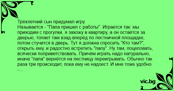 Называется - "Папа пришел с работы". Играется так: мы приходим с прогулки, я захожу в квартиру, а он остаётся за дверью, топает там взад-вперёд по лестничной площадке, потом стучится в дверь. Тут я должна спросить "Кто там?", открыть ему, и радостно встретить "папу". Ну там, поцеловать, всячески поприветствовать. Причём играть надо натурально, иначе "папа" вернётся на лестницу переигрывать. Обычно так раза три происходит, пока ему не надоест. И мне тоже удобно - я как раз успеваю раздеться спокойно.