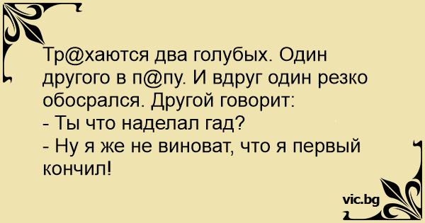 Тр@хаются два голубых. Один другого в п@пу. И вдруг один резко обосрался. Другой говорит: