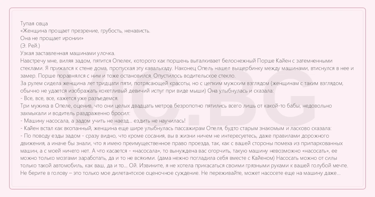 Тупая овца «Женщина прощает презрение, грубость, ненависть. Она не прощает иронии» (Э. Рей.) Узкая заставленная машинами улочка. Навстречу мне, виляя задом, пятится Опелек, которого как поршень выталкивает белоснежный Порше Кайен с затемненными стеклами. Я прижался к стене дома, пропуская эту кавалькаду. Наконец Опель нашел выщербинку между машинами, втиснулся в нее и замер. Порше поравнялся с ним и тоже остановился. Опустилось водительское стекло. За рулем сидела женщина лет тридцати пяти, потрясающей красоты, но с цепким мужским взглядом (женщинам с таким взглядом, обычно не удается изображать кокетливый девичий испуг при виде мыши) Она улыбнулась и сказала: - Все, все, все, кажется уже разъедемся. Три мужика в Опеле, оценив, что они целых двадцать метров безропотно пятились всего лишь от какой-то бабы, недовольно захмыкали и водитель раздраженно бросил: - Машину насосала, а задом учить не наезд… ездить не научилась! - Кайен встал как вкопанный, женщина еще шире улыбнулась пассажирам Опеля, будто старым знакомым и ласково сказала: - По поводу езды задом - сразу видно, что кроме сосания, вы в жизни ничем не интересуетесь, даже правилами дорожного движения, а иначе бы знали, что я имею преимущественное право проезда, так, как с вашей стороны помеха из припаркованных машин, а с моей ничего нет. А что касается - «насосала», то вынуждена вас огорчить, такую машину невозможно «насосать», ее можно только мозгами заработать, да и то не всякими. (дама нежно погладила себя вместе с Кайеном) Насосать можно от силы только такой автомобиль, как ваш, да и то… Ой. Извините, я не хотела прикасаться своими грязными руками к вашей голубой мечте. Не берите в голову – это только мое дилетантское оценочное суждение. Не переживайте, может насосете еще на машину даже покруче моей, вас ведь все таки трое, тем более, что, как я подозреваю, мужские гонорары в этом деле, куда выше женских… Тут мужики очнулись, от этого обволакивающего воркования и один из них заорал в открытое окно: - Э, ты че? Хочешь сказать, что мы сосем!? Дама наморщила лобик, глянула на часики и быстро ответила: - Я бы с удовольствием еще поболтала с вами и послушала что и как вы там сосете, кто из вас глотает, а кто сплевывает, но к сожалению опаздываю на встречу. Хорошего дня и удачи в делах. …Женщина отпустила мужикам воздушный поцелуй и ее Кайен сдуло, как будто гигантский мальчик дернул его за невидимую веревочку. Водитель Опеля встретился со мной взглядом и решил поделиться своими наблюдениями: - Нет, ну ты видел? Вот же тупая овца… © Грубас