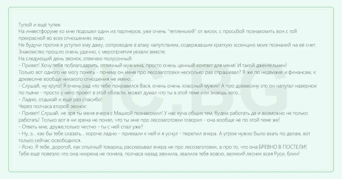 Тупой и ещё тупее На инвестфоруме ко мне подошел один из партнеров, уже очень "тепленький" от виски, с просьбой познакомить вон с той прекрасной во всех отношениях леди. Не будучи против я уступил ему даму, сопроводив в атаку напутствием, содержавшим краткую эссенцию моих познаний на её счет. Знакомство прошло очень удачно, с мероприятия уехали вместе. На следующий день звонок, отвечаю полусонный: - Привет! Хочу тебя поблагодарить, отличный мужчина, просто очень ценный контакт для меня! И такой джентельмен! Только вот одного не могу понять - почему он меня про лесозаготовки несколько раз спрашивал? Я же по недвижке и финансам, к древесине вообще никакого отношения не имею... - Слушай, ну круто! Я очень рад что тебе понравился Вася, очень очень классный мужик! А про древесину это он напутал наверное по пьяни - просто у него проект в этой области, может думал что ты в этой теме или знаешь кого... - Ладно, отдыхай и ещё раз спасибо! Через полчаса второй звонок: - Привет! Слушай, не зря ты меня вчера с Машкой познакомил! У нас куча общих тем, будем работать да и возможно не только работать! Только вот я ни хpeнa не понял, что ты мне про лесозаготовки говорил - она вообще не по этой теме же! - Ответь мне, друже,только честно - ты с ней спал уже? - Ну, э... как бы тебе сказать... короче ладно - приехали к ней и я уснул - перепил вчера. А утром нужно было ехать по делам, вот только сейчас освободился. - Ясно. Я тебе, дорогой, как опытный товарищ рассказывал вчера не про лесозаготовки, а про то, что она БРЕВНО В ПОСТЕЛИ! Тебе ещё повезло что она нихрена не поняла, полчаса назад звонила, хвалила тебя вовсю, великий лесник всея Руси, блин!