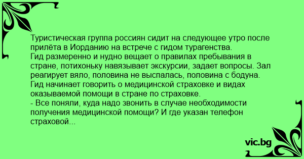Гид размеренно и нудно вещает о правилах пребывания в стране, потихоньку навязывает экскурсии, задает вопросы. Зал реагирует вяло, половина не выспалась, половина с бодуна. Гид начинает говорить о медицинской страховке и видах оказываемой помощи в стране по страховке.