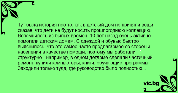 Тут была история про то, как в детский дом не приняли вещи, сказав, что дети не будут носить прошлогоднюю коллекцию.