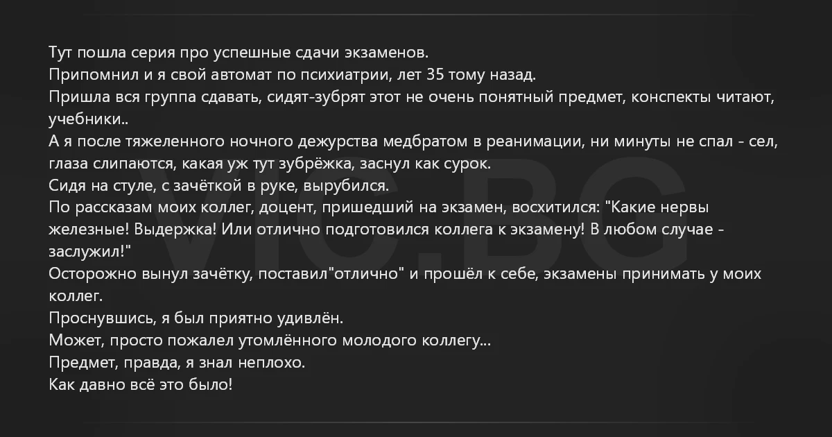 А я после тяжеленного ночного дежурства медбратом в реанимации, ни минуты не спал - сел, глаза слипаются, какая уж тут зубрёжка, заснул как сурок.