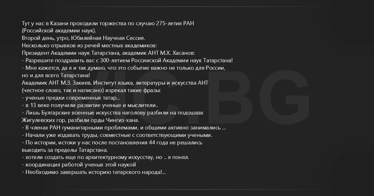 Тут у нас в Казани проходили торжества по случаю 275-летия РАН (Российской академии наук). Второй день, утро, Юбилейная Научная Сессия. Несколько отрывков из речей местных академиков: Президент Академии наук Татарстана, академик АНТ М.Х. Хасанов: - Разрешите поздравить вас с 300-летием Россииской Академии наук Татарстана! - Мне кажется, да я и так думаю, что это событие важно не только для России, но и для всего Татарстана! Академик АНТ М.З. Закиев, Институт языка, литературы и искусства АНТ (честное слово, так и написано) изрекал такие фразы: - ученые предки современных татар... - в 13 веке получили развитие ученые и мыслители.. - Лишь Булгарские военные искусства наголову разбили на подошвах Жигулевских гор, разбили орды Чингиз-хана. - В членах РАН гуманитарными проблемами, и общими активно занимались ... - Начали уже издавать труды, совместные с соответствующими учеными. - По истории, истоки у нас после постановления 44 года не решались выходить за пределы Татарстана. - хотели создать еще по архитектурному искусству, но .. я понял. - координация работой ученых этой наукой - Необходимо завершать историю татарского народа! А вы говорите - Военная кафедра.