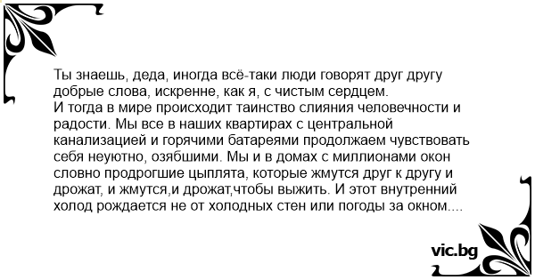 Ты знаешь, деда, иногда всё-таки люди говорят друг другу добрые слова, искренне, как я, с чистым сердцем.