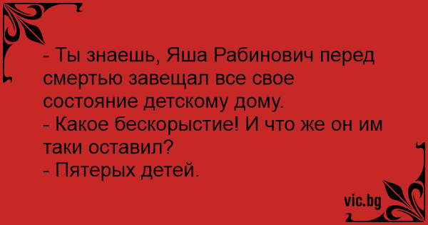 - Ты знаешь, Яша Рабинович перед смертью завещал все свое состояние детскому дому.