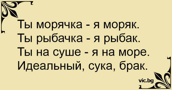 Ты морячка - я моряк. Ты рыбачка - я рыбак. Ты на суше - я на море. Идеальный, cуka, брак.