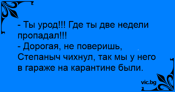 - Дорогая, не поверишь, Степаныч чихнул, так мы у него в гараже на карантине были.