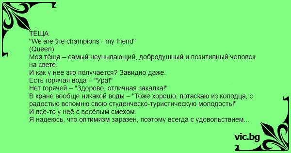 ТЁЩА "We are the champions - my friend" (Queen) Моя тёща – самый неунывающий, добродушный и позитивный человек на свете.